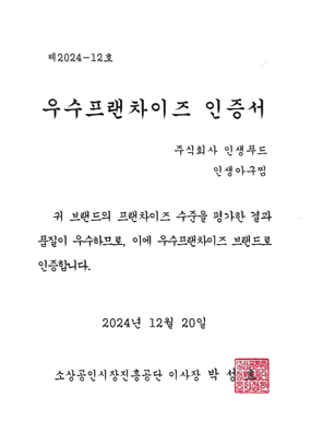 우수프랜차이즈 인증서/ISO14001/ISO9001/벤처기업확인서/이노비즈