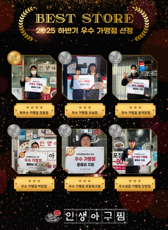 수상 매장에는 우수 가맹점 명패와 물류 지원 혜택이 제공됐다. 인생아구찜은 이 같은 지원을 통해 가맹점의 지속적인 품질 관리 노력을 독려하고, 전국 매장의 운영 수준을 균일하게 유지해 나간다는 방침이다.